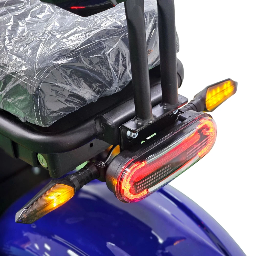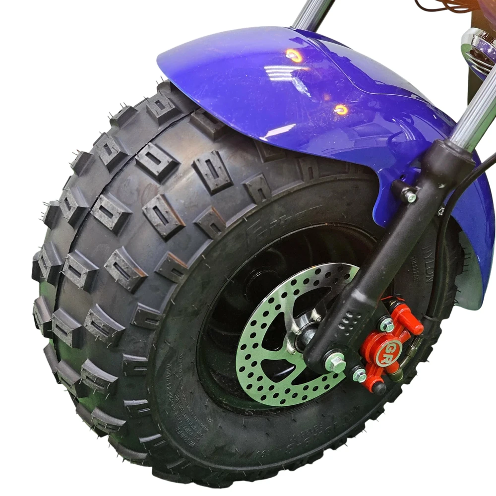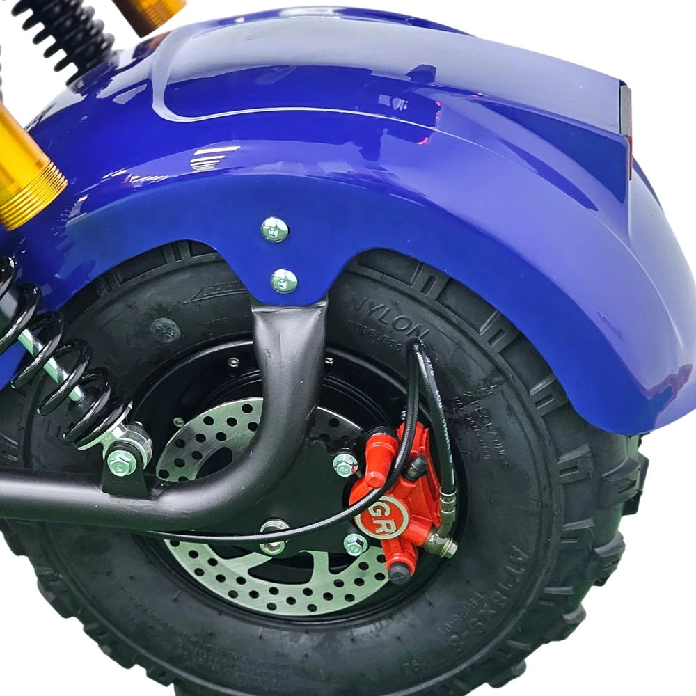 Citycoco GT X7 PRO выделяется не только техническими характеристиками, но и высоким уровнем комфорта. Складные подножки для второго пассажира и просторная дека для ног делают поездки удобными для двоих. Гидравлические тормоза гарантируют безопасное торможение, а система освещения, включающая фары, страбаскопы, стоп-сигнал и поворотники, обеспечивает видимость и безопасность в любое время суток. Этот скутер — идеальный выбор для тех, кто ценит стиль, мощность и функциональность.