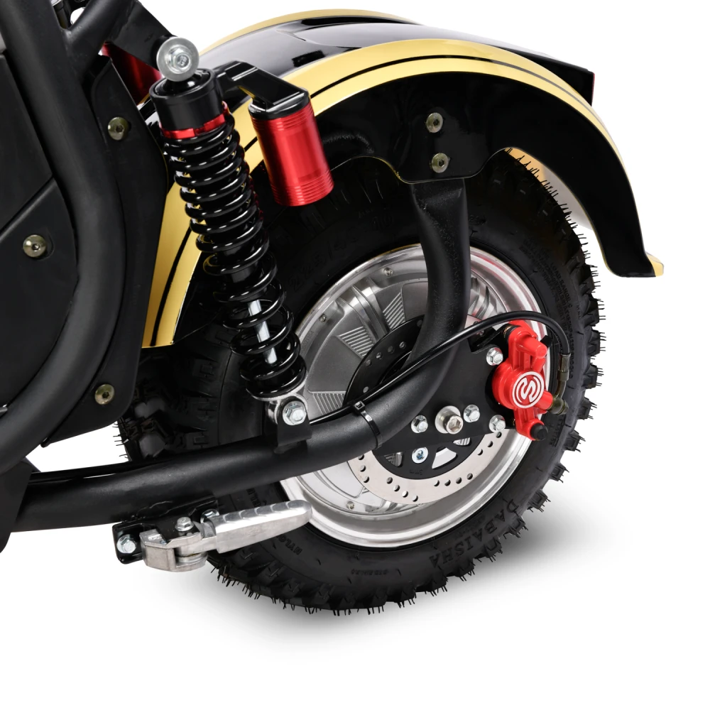 Мощность мотора 2000 Вт (номинал) обеспечивает разгон до 45 км/ч и подъемов до 20–25° даже при полной нагрузке 260 кг, но на неровностях или в дождь скорость падает. Аккумулятор Li-ion 60V дает заявленный пробег 60 км в идеале (Eco-режим, ровный асфальт), балансируют скорость/запас хода, снижая потребление на 20–30% в Eco. Тормоза — гидравлические дисковые (диаметр 120–140 мм), эффективны на мокром асфальте; энергоэффективность высока благодаря рекуперации (5–10% возврата энергии); зарядка (7 часов) стандартна для Li-ion без потери срока службы.