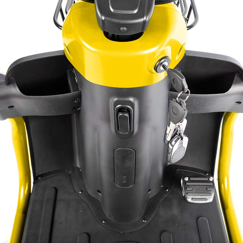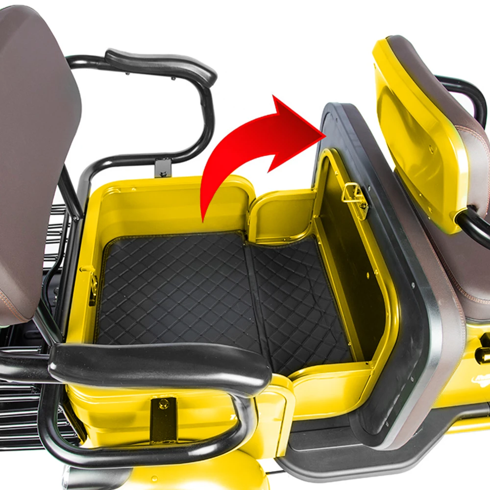 Электротрицикл Rutrike Топик желтый – техника представлена ярким дизайном. Востребована активными целеустремленными личностями, предпочитающими отдых на свежем воздухе. Также модель популярна в частном бизнесе и туристическом сервесе. Стальная конструкция рамы выдерживает максимальную грузоподъемность, не деформируется и не теряет первоначальных характеристик. Комфорт обеспечен широкими сиденьями из эко-кожи. Водительское сиденье анатомическое со спинкой и подлокотниками, исключает усталость и проблемы с позвоночником. В заднем сиденье имеется отсек для груза, может использоваться в качестве багажника. Мягкая платформа исключает отек ног. Мощность электромотора составляет 800 Вт. Батарея в комплектации отсутствует. Производитель предупреждает, что для данной модели трицикла необходимая емкость аккумуляторной батареи составляет 48 В и 60 В. Колесная часть – накатистая, 10-дюймовая, отлично сцепляется с разными видами поверхности. Наличие яркого светодиодного освещения, фирменных тормозов и зеркал заднего вида увеличивает степень безопасности езды, допускает эксплуатацию техники в вечернее время и непогоду. Для приобретения модели оперативно, по приемлемой цене предлагаем прямо сейчас сделать телефонный звонок нашему менеджеру или связаться с ним в чате.