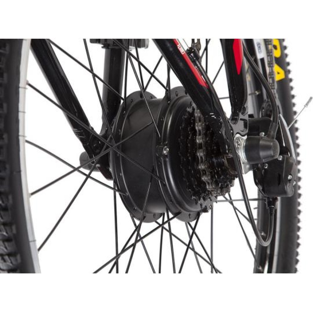 Электровелосипед Eltreco Impulse EM 502 оборудован редукторным двигателем мощностью 300 Вт, он позволяет набирать равномерное ускорение и имеет экономное энергопотребление. Максимальная скорость транспортного средства 25 км/ч. Ободная тормозная система регулирует движение. На бездорожье амортизированная передняя вилка смягчает вибрацию. Литий-ионный аккумулятор емкостью 9 А*ч позволяет проехать на одном заряде 35 км пути при полной нагрузке. Он легко снимается с посадочного места. Зарядное устройство, идущее в комплекте, необходимо подключить на 6 часов для пополнения заряда до 100 процентов.