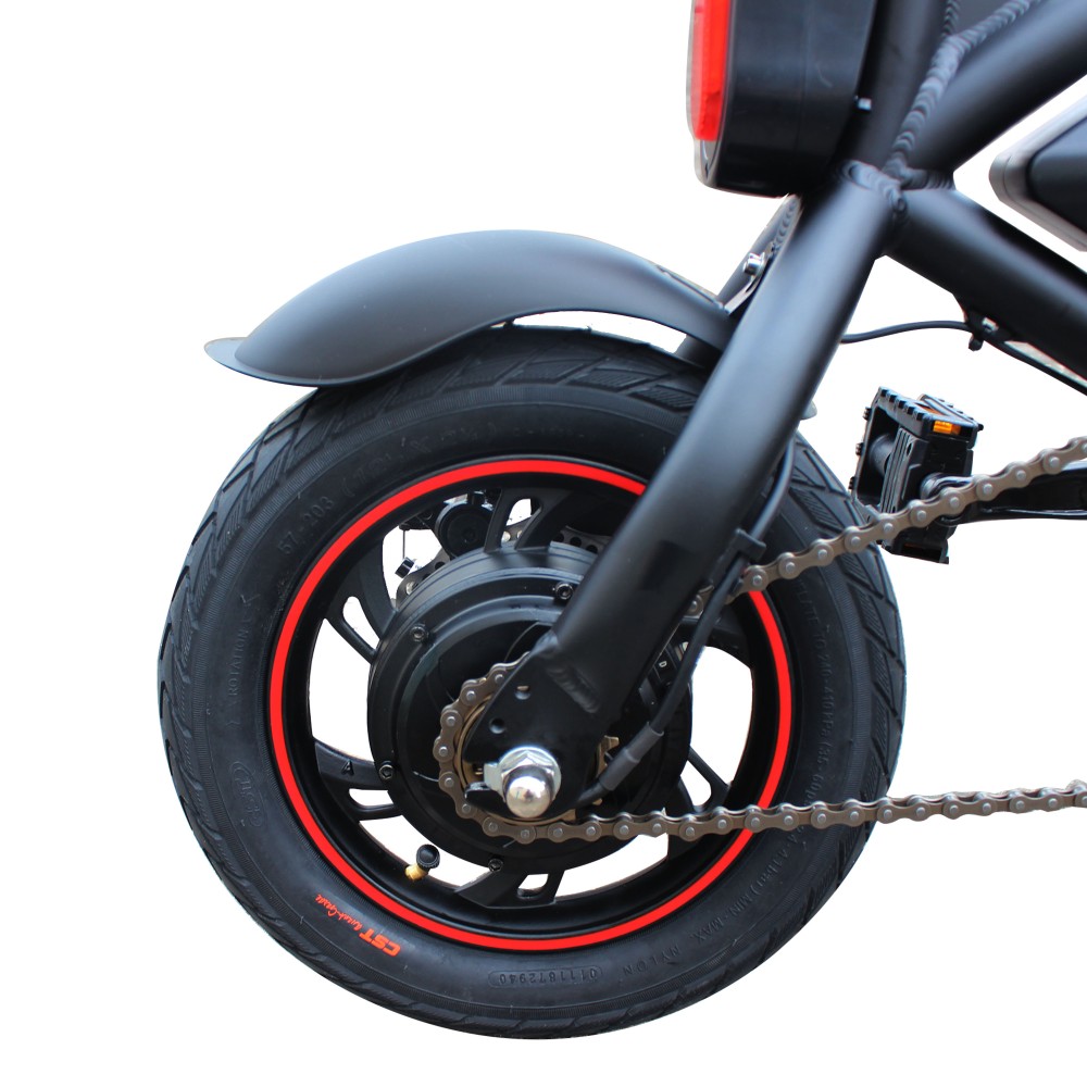 Мощные 12 дюймовые колеса и широкими шинами повышают проходимость байка, они усилены литыми дисками. На переднем и заднем колесе установлены дисковые тормоза.