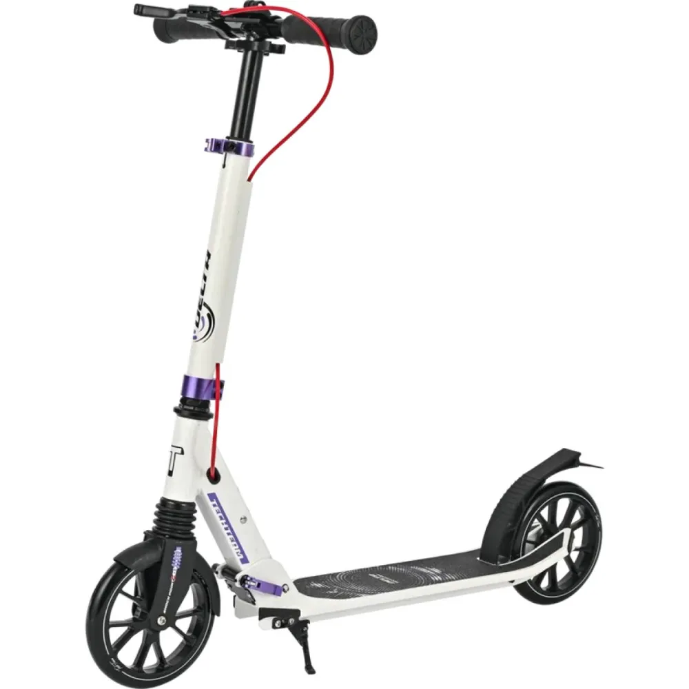 Техника массой 4,4 кг рассчитана на детей от 5 лет весом до 50 кг для езды по городской местности и парковой зоне. Рулевая часть регулируется в трёх положениях - 750-820-890 мм. Самокат оснащен зажимом, предупреждающий люфт, являющийся источником постороннего шума. Дека – вместительная, нескользящая, длиной 53 см и шириной 12 см. Допускает размещение 2-х стоп одновременно. Изготовлена из высокопрочного алюминия, не деформирующегося под максимальными нагрузками. Колесная часть – полиуретановая, мало стираемая, размерами 180 мм с подшипниками ABEC 7 Chrome. В сочетании с брендовой тормозной системой и прорезиненными грипсами, повторяющими анатомические части руки модель гарантирует безопасность ездока во время катания.